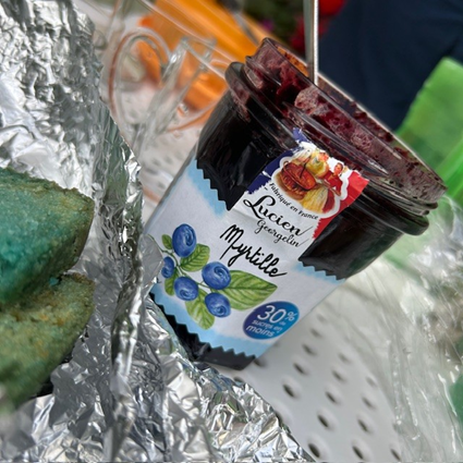 Après cette marche joyeuse, tout le monde s’est retrouvé sur la terrasse du bar de l’EHPAD pour un moment de convivialité et de découverte culinaire autour du thème du bleu. Les assistantes maternelles avaient préparé de délicieuses surprises : gâteau bleu, rochers à la noix de coco bleus, sirop de violette et bien d’autres gourmandises aux nuances originales et poétiques.