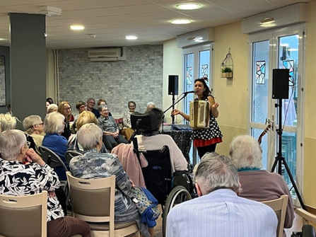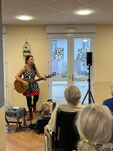 Nous tenons à remercier chaleureusement Marie Pétrolette pour sa présence, son talent, et sa générosité. Merci aussi Anne et Gaëlle de la bibliothèque pour son implication et pour avoir coorganisé ce moment merveilleux. Et surtout, un grand merci à aux résidents : leur joie et leur participation ont rendu ce concert inoubliable.